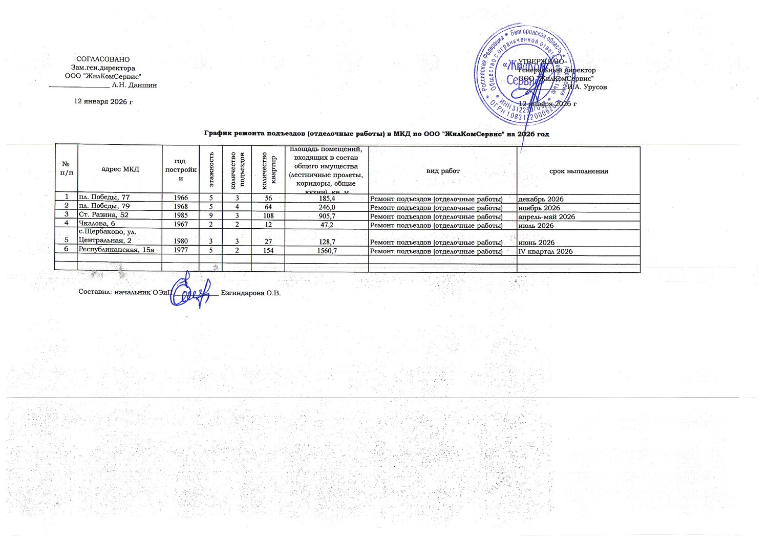 Планы работ на многоквартирных домах, находящихся в управлении ООО "ЖилКомСервис"