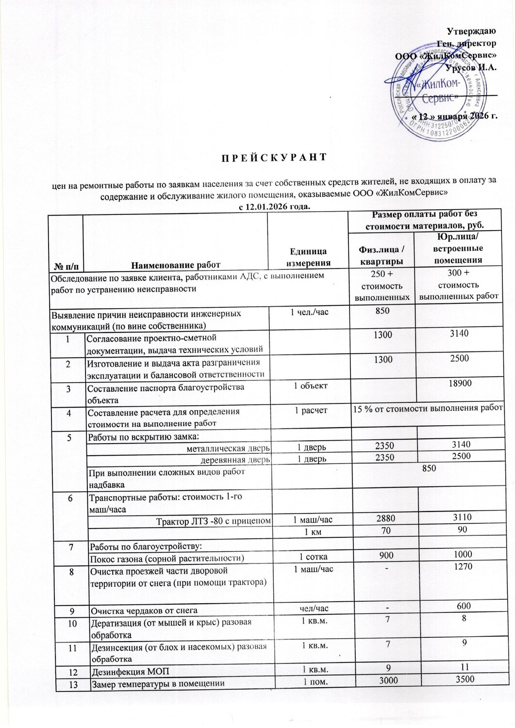 Прейскурант цен на 2026 год